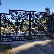 Eye Catching Modern Metal Driveway Gate With Trellis Panels And Greek Key Detail Along The Top Wrought Iron Driveway Gates Metal Driveway Gates Modern Trellis